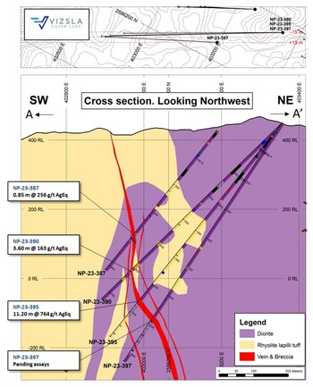 NP-23-395 returned 764 grams per tonne (g/t) silver equivalent (AgEq) over 11.20 metres true width (mTW) (229 g/t silver, 7.14 g/t gold, 0.34 % lead and 1.64 % zinc) Including, 10,485 g/t AgEq over 0.64 mTW (3,140 g/t silver, 102.00 g/t gold, 2.99 % lead and 16.30 % zinc)NP-23-376 returned 415 g/t AgEq over 5.65 mTW (340 g/t silver, 1.23 g/t gold, 0.15 % lead and 0.34 % zinc)NP-23-377 returned 342 g/t AgEq over 7.70 mTW (67 g/t silver, 1.80 g/t gold, 0.75 % lead and 3.74 % zinc) Including, 1,612 g/t AgEq over 0.54 mTW (250 g/t silver, 12.35 g/t gold, 5.65 % lead and 10.45 % zinc)NP-23-381A returned 503 g/t AgEq over 5.00 mTW (155 g/t silver, 2.49 g/t gold, 0.91 % lead and 4.52 % zinc) Including, 1,194 g/t AgEq over 0.97 mTW (476 g/t silver, 9.29 g/t gold, 1.60 % lead and 2.11 % zinc)