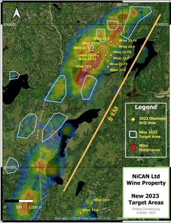TORONTO, Sept. 27, 2023 /CNW/ - NiCAN Limited ("NiCAN" or the "Company") (TSXV: NICN) is pleased to provide details on its upcoming Phase III drill program on the Wine Property, located in the Snow Lake area of Manitoba, Canada (Figure 3). Permits are in place, a drill contractor has been selected, and preparation work is underway. Initially, Phase III drilling will consist of a 1,500 to 2,000-meter diamond drilling program, which is scheduled to commence in October 2023. The Phase III program will focus on expanding the recently identified nickel-bearing zones to the east of the Wine Occurrence and test newly defined geophysical targets along strike of the Wine Occurrence over distances of up to 4.8 km.