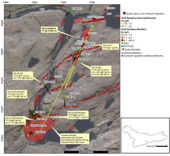 Annick: Previous exploration work identified the Annick Boulder Trend, an approximately 3.5 km long trend of angular quartz-carbonate boulders (up to several metres in size) containing pyrite +/- sulfosalts, galena, sphalerite, arsenopyrite and graphite grading up to 648 g/t Au (see Orford's news release dated December 8, 2021, Figure 1). The possible Annick structure was intercepted in 3 holes 22-QK-002, 22-QK-011, QK-23-RAB015 (Figure 1). QK-23-RAB015 intercepted 0.95 g/t Au over 1 m, 400 m to the NE along trend from 22-QK-002 which reported 10.6 m at 0.9 g/t including 2.6 m @ 2.3 g/t Au (See Orford's news release November 8, 2022). This information along with the narrow dispersion (<30 m) of high grade boulders and gold grains in till suggest that there has been very little transport in the Annick Boulder Trend and the surface expression of the previously noted high grade boulders may be coincident with a structure(s), sub-parallel to the ice flow direction, which hosts pockets or "shoots" of quartz vein mineralization. Future programs will aim to increase drill density in the sector to obtain thicker higher grade intercepts along with detailed grid mapping and potential trenching.