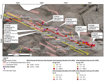 Esperance: The Esperance area of the Qiqavik belt property hosts a trend of copper and gold mineralization hosted in a basalt shear zone and is recognized for over 4 km in length. In 2023, prospecting and mapping identified two new zones of outcropping sheared basalt-hosted sulphides with up to 5% chalcopyrite. New Outcrop #1 (0.44% Cu over 0.5m -channel sample, Figure 3) occurs as a series of discontinuous outcrops over 10 m by 25 m and is located 200 m to the south of the main Esperance trend and may represent secondary and tertiary (New Outcrop #2 370 metres to the south of the main Esperance trend) parallel mineralized zones. Airborne EM conductors suggest the mineralization may extend to the east and west of each outcrop. Similarly, there are at least 6 additional parallel conductive trends to the main Esperance copper-gold trend which may also host copper sulphide and gold mineralization. These parallel conductive trends are planned to be a focus of a 2024 exploration program.