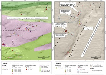 Central/Gerfaut: Two vein systems were discovered on the Qiqavik property in 2023, one at the Central Intrusion and one at Gerfaut East. The Gerfaut East vein system is found within a dominant NNE-trending structural corridor that is oblique to the EW Qiqavik Break and can be traced for an over 400 m strike length (previously covered by permanent snow). Gerfaut East is an intrusion-associated Au (+/- Ag, Pb, Cu, Zn) vein system. The area is overprinted by multiple phases of deformation. At surface, sulphide-bearing quartz veins are up to 15 m in length and may contain variable amount of quartz +/-galena, chalcopyrite and pyrite. Assays received to date from surface grab samples have returned up to 32.3 g/t Au (Figure 4). All six RAB drillholes completed at Gerfaut East intersected quartz vein within the top 50m of drilling. Results from drilling are summarized in Table 2.