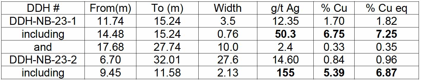 The Company has only received assay results for the first 2 shallow holes targeting the area of copper mineralization. Assay results for the first 2 holes are reported below: