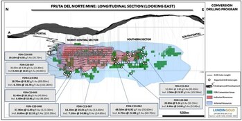 VANCOUVER, BC, Nov. 1, 2023 /CNW/ - Lundin Gold Inc. (TSX: LUG) (Nasdaq Stockholm: LUG) (OTCQX: LUGDF) ("Lundin Gold" or the "Company") today announces recent results from its conversion and near-mine exploration programs at its 100% owned Fruta del Norte ("FDN") gold mine in southeast Ecuador. The 2023 conversion drilling program, targeting Inferred Mineral Resources ("Inferred Resources") within the FDN deposit, has now been concluded and several high-grade results confirm mineralization immediately adjacent to where operations in the mine are currently taking place. In parallel, the near-mine program has successfully advanced in defining and expanding Bonza Sur, a new epithermal system discovered to the south of FDN.