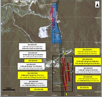 - Drill hole BLP-2023-053 intersected 5.87 g/t Au over 11.90m from 168.4 m, including 14.39 g/t Au over 4.0m