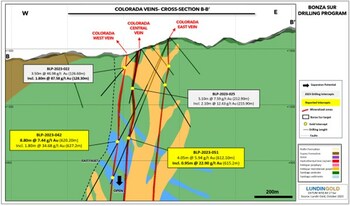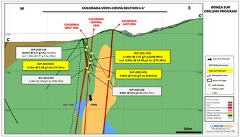 Since the discovery of Bonza Sur, numerous drilling intercepts suggest the occurrence of three subparallel vein/veinlet zones, called Colorada Central, West, and East. This epithermal system is believed to extend to surface and stretches for 850 metres along the north-south strike and for at least 500 metres at depth in the central area. BLP-2023-42 represents the deepest intercept at Bonza Sur. Gold mineralization remains open in all directions (see figures 2, 3 and 4).