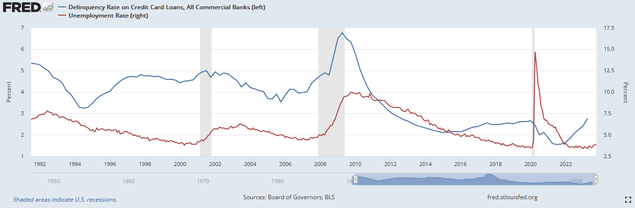 All this on the back of consumers now showing weakness. Unemployment is still <4% and yet credit card delinquencies are already rising.