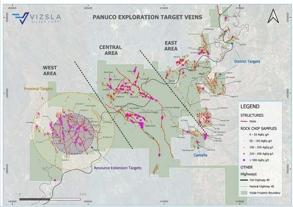Figure 1: Plan map of the Panuco district highlighting primary exploration targets relative to mapped and sampled mineralized veins. The purple ellipse represents Resource Extension targets, the yellow ellipse represents Proximal targets, and the blue arrows represent distal District targets. (CNW Group/Vizsla Silver Corp.)