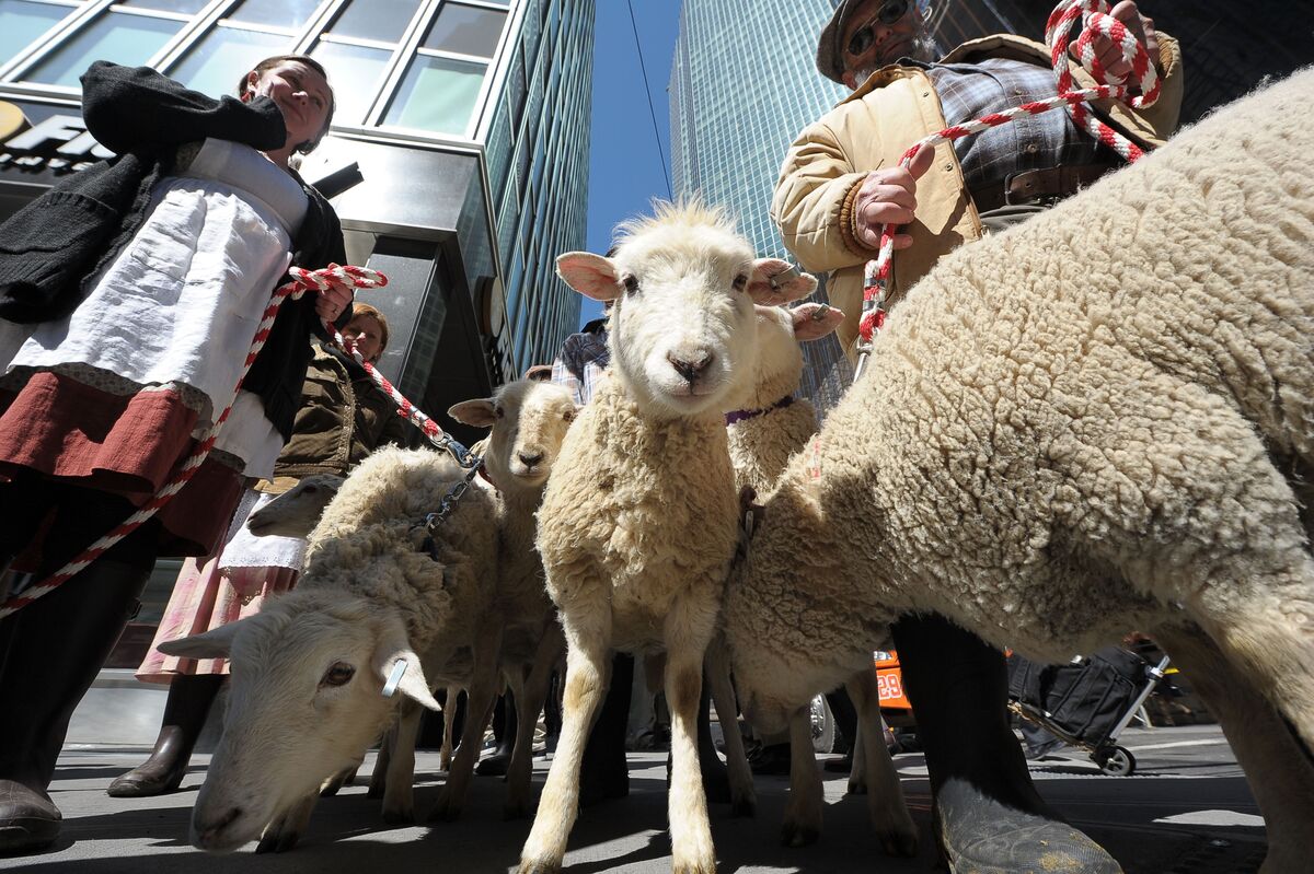 English farmers and their sheep parade through New York City in celebration of Zynga's first major FarmVille release, FarmVille English Countryside, in 2011.Photographer: Michael Loccisano/Getty Images ----------------------------------------