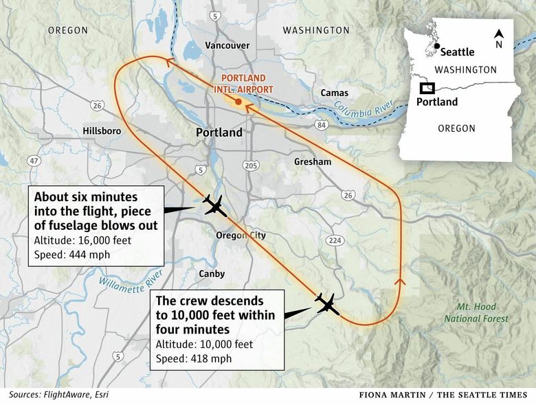 The Alaska Airlines plane departed from Portland and had risen to 16,000 feet when a large rectangular hole opened next to an empty seat. The plane, which had been headed to Ontario, Calif., made an emergency landing at Portland International Airport 20 minutes after taking off.