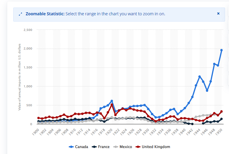 Total value of annual imports into the United States from its main Allied trading partners from 1900 to 1950(in million U.S. dollars)