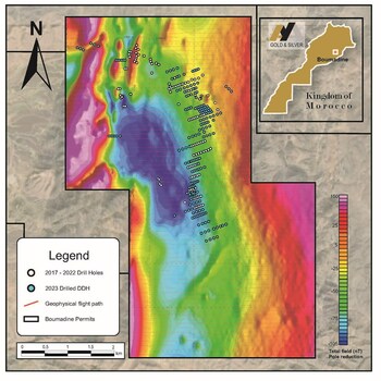Figure 1 – Surface Plan of Boumadine Property with Magnetic Data (Residual Total Field) and 2023 Drill Holes (CNW Group/Aya Gold & Silver Inc)