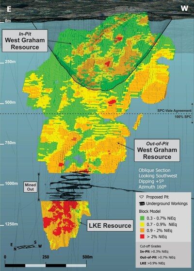 Figure 2: Oblique long section of the Lockerby East Property showing the location of the West Graham (In-Pit and Out-of-Pit) Resources as well as the LKE Resource. Section is orientated at 060 degrees looking to the southwest. (CNW Group/SPC Nickel Corp.)