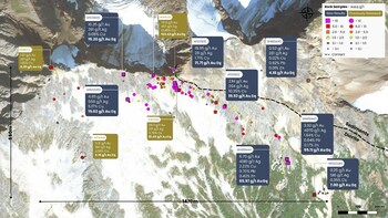 These latest results from Copper Ridge define a high-grade silver trend with values up to 4,610 g/t Ag and 4,040 g/t Ag with elevated gold and copper assays that are in alignment with previously published results (see news releases dated January 26th, November 8th, and November 28th, 2023). The Copper Ridge zone hosted within a diorite now stretches over an east-west length of approximately 1,500 metres, a north-south length of 650 metres and an elevation differentiation of 470 metres. Additional prospecting occurred in the sediments east of the mineralized dioritic intrusion. Sampling of numerous quartz veins returned anomalous silver values, except for one which contains silver, gold and lead (sample W489445 see table 1).