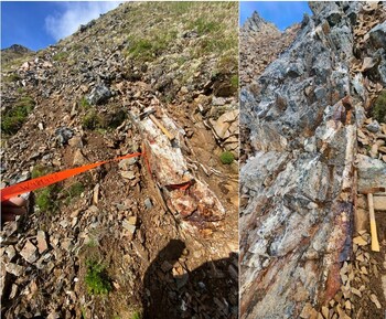 Figure 3 illustrates a high-grade quartz vein of about 25 cm outcropping in a debris field (on the left side, W489443). The erratic block sampled about 20 m uphill (W489444) indicates the presence of a similar vein hidden further up. On the right side, the high-grade gold quartz vein sampled (W501810) is within a cliff where other high-grade veins were sampled more downhill.
