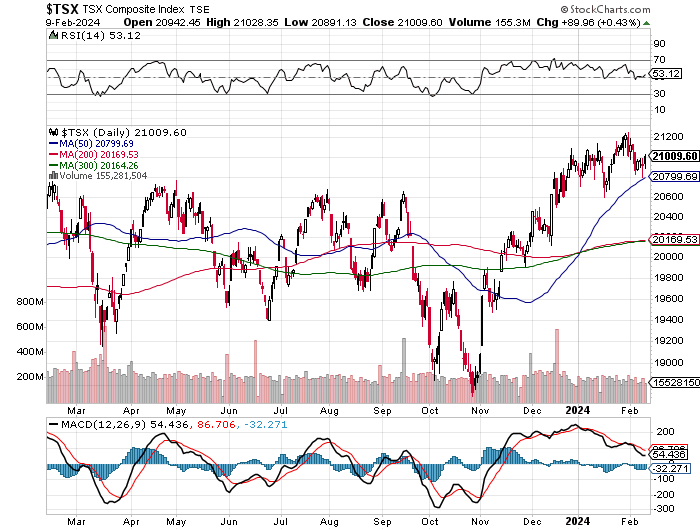 The DOW, SPX, QQQ continued to make new highs. The TSX also moved upwards but is shy of this year's high. The SPX is the only index of the four that is in overbought territory.