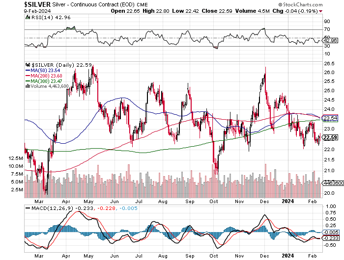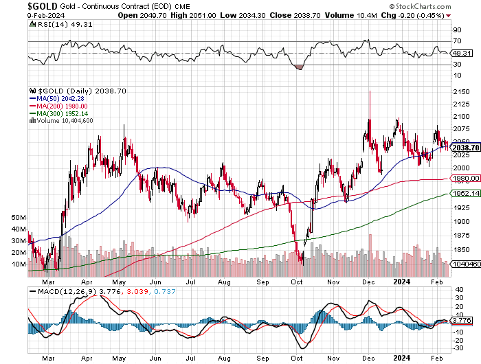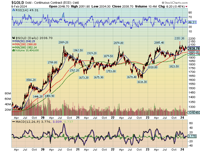 Gold closed the week at $2,038 just below last week's close. It is trading above its 200 dma which is now rising. The HUI dropped further still trading below its 200 dma. The MACD turned downward.