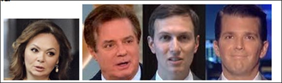 2016: Trump’s campaign manager Paul Manafort, Trump’s son-in-law Jared Kushner, and Trump’s son Donald Jr meet at Trump Tower with Russian lawyer Natalia Veselnitskaya who offered information that could be used against Hillary Clinton in return for a lifting of US sanctions against Russia