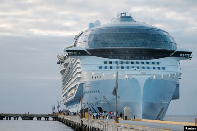 Tourists leave the Royal Caribbean's Icon of the Seas, the largest cruise ship in the world, after arriving at Costa Maya Cruise Port, in the village town of Mahahual, Quintana Roo state, Mexico, Feb. 6, 2024. (Reuters/Paola Chiomante)