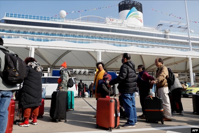 Passengers wait in line to board China's first domestically built cruise ship the Adora Magic City in Shanghai, on Jan. 1, 2024. (AFP)