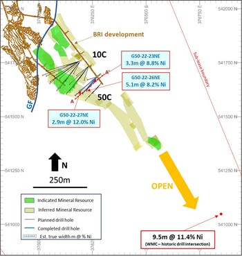 The first set of drilling results from the current 50C program demonstrate the potential for additional high-grade nickel mineralization associated with the Gamma Block Nickel Mineral Resource. Highlights from six drill hole results1 received to date are summarized below: