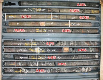 Figure 3: Drill hole G50-22-26NE showing massive nickel sulphide intersection and % Ni assays with high-grade core intervals, 87.9m to 95.0m. (CNW Group/Karora Resources Inc.)