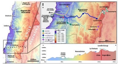 Location of a conceptual multi-user, desalination water network in relation to infrastructure and potential customers in the Huasco valley region of the southern Atacama, Chile (CNW Group/Hot Chili Limited)