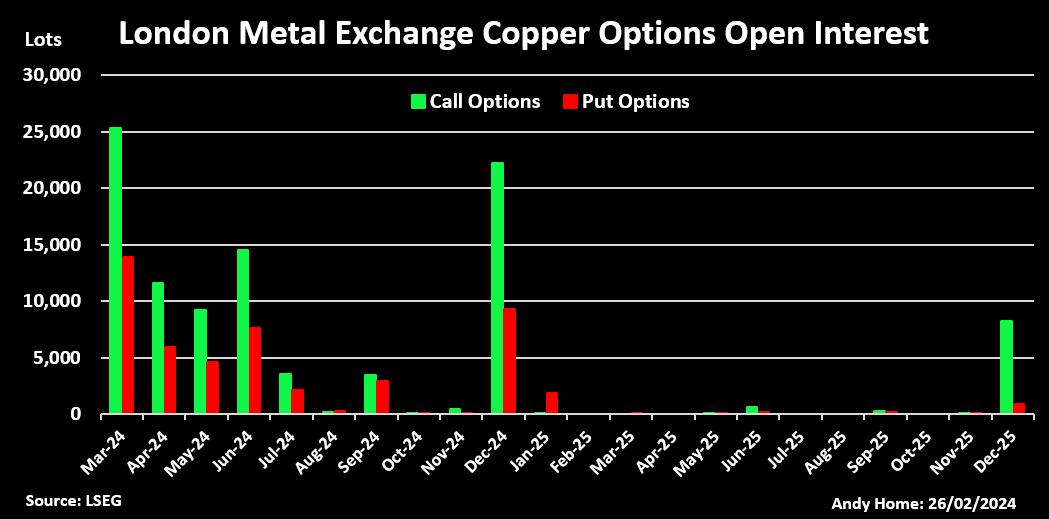 LME copper options open interest is heavily weighted towards the front end of the price curve with the exception of December 2024 and December 2025.