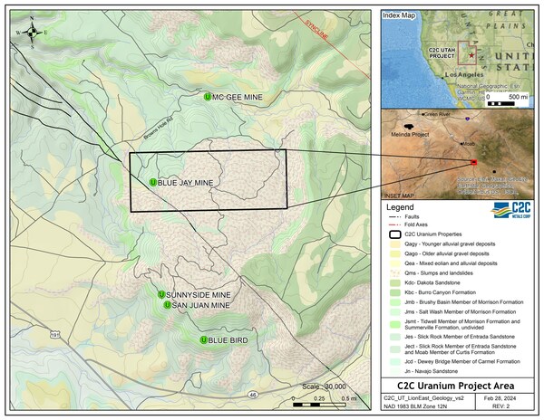 VANCOUVER, BC, April 2, 2024 /PRNewswire/ - C2C Metals Corp. (CSE: CTOC) (the "Company" or "C2C") reports today the acquisition of its second United States uranium project acquired through claim staking. The project was identified and drilled by URADCO in 1981 establishing a historic resource as detailed below. The Blue Jay Mine Project lies in San Juan County, Utah, and is located in the La Sal Uranium District which is recognized as the second most significant uranium producer in the Utah-Colorado region.