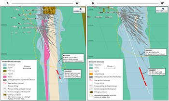 Extensional drilling has been achieved by extending resource conversion drill holes beyond the resource shell to the north, northeast, and at depth to approximately 1,700 mRL; extending mineralisation approximately 750 metres below the bottom of the open pit. Extensional drilling has focused on (a) depth extension of Balut Dyke mineralization on the northern side of the Syenite Porphyry (Figure 3, section A – A'), and (b) depth extension of mineralization within the Monzonite in Panel 4 (Figure 3, section B – B').