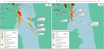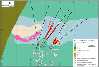 Figure 1: Schematic long section (looking north-west) showing Horseshoe and Horseshoe Extension mineralisation at Haile and recent drillholes annotated. (CNW Group/OceanaGold Corporation) Figure 2: Simplified geologic plan showing Didipio drilling since February 2024 press release with significant intercepts and approximate mineralized envelope at the 2,190mRL. Sections A-A’ through F-F’ also shown. (CNW Group/OceanaGold Corporation) Figure 3: Long sections (A-A’ and B-B’) of geological model with new intercepts annotated. (CNW Group/OceanaGold Corporation) Figure 4 (1): Geological sections C-C’, D-D’, showing conversion drilling. (CNW Group/OceanaGold Corporation) Figure 4 (2): Geological sections E-E’ and F-F’ showing conversion drilling. (CNW Group/OceanaGold Corporation)