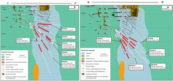 Resource Conversion drilling has focused on (i) conversion of the inferred resource within the Monzonite Porphyry directly east of the Syenite Porphyry within Panel 3 (< 2,100 mRL, Figure 4, C-C', D-D'), and (ii) infill drilling of the mineralized Eastern Breccia and Feldspar Porphyry in the east (Figure 4, section E-E' and F-F'). These drill programs broadly confirm and provide improved confidence in the inferred grade estimates as calculated in the end of year 2023 annual resource and reserve model.