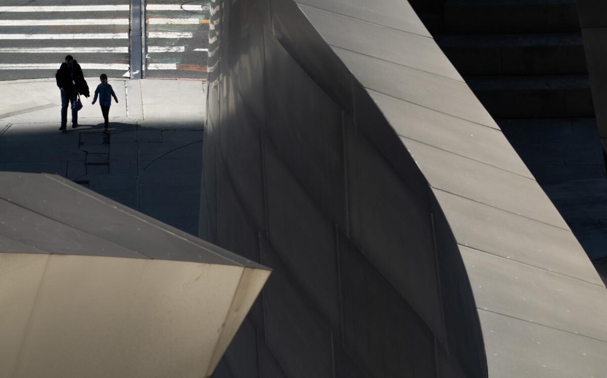 Pedestrians walk past Walt Disney Concert Hall on Saturday. Sunshine and warmer temperatures in the coming days will give way to another cold storm this weekend.