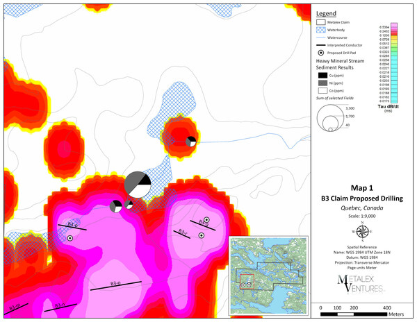 The 24,322 hectare B3 claim block was staked in 2022 as it contains copper-nickel-cobalt sulphides as shown by the Company's heavy mineral and soil-till-talus sampling (see Map 1). In late 2023 Metalex had a VTEM airborne geophysical survey completed over its B3 claim block by Geotech Ltd.