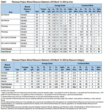 As outlined in Tables 1 and 2, the Plomosas Project, including the San Marcial ā Plomosas Mine - San Juan/La Colorada areas, hosts 55 million ounces of silver or 85 million ounces of silver equivalent in the Indicated category, and 22 million ounces silver or 45 million ounces of silver equivalent in the Inferred category. The full technical report dated May 3rd, 2023, with an effective date of March 15th, 2023, is entitled "Technical Report and Mineral Resource Update for the Plomosas Project". The report was prepared for GR Silver Mining Ltd. by Dr. Gilles Arseneau, P.Geo. of ARSENEAU Consulting Services Inc. and can be found under the Company issuer profile at SEDAR+.