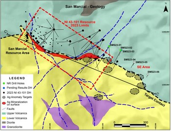Figure 2: San Marcial Area Geology. Note the Ag anomalies along the target contact to the southeast. (CNW Group/GR Silver Mining Ltd.)