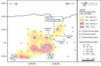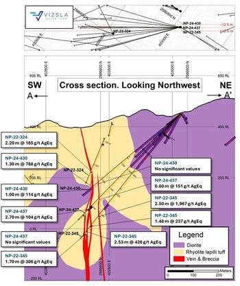 - NP-24-430 returned 788 grams per tonne (g/t) silver equivalent (AgEq) over 1.30 metres true width (mTW) (682 g/t silver, 2.07 g/t gold, 0.17% lead and 0.23% zinc)