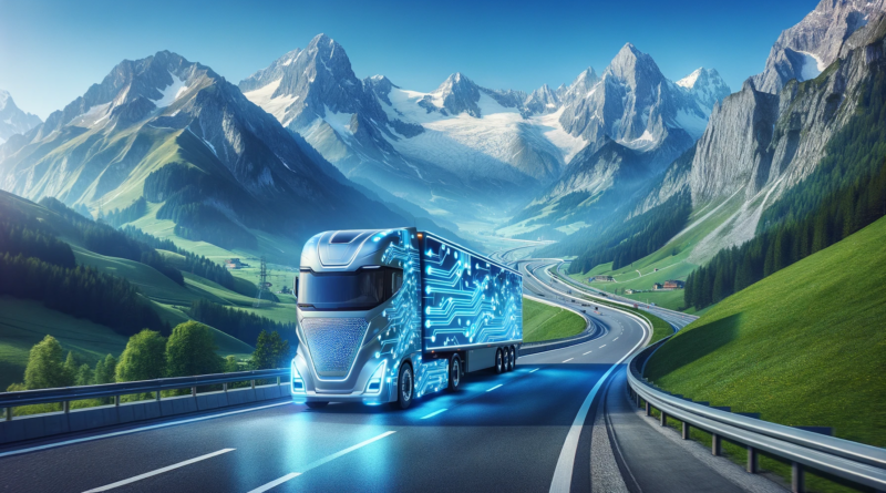 ChatGPT & DALL-E generated panoramic image of an electric European semi trailer covered in circuitry driving on a highway through the Alps