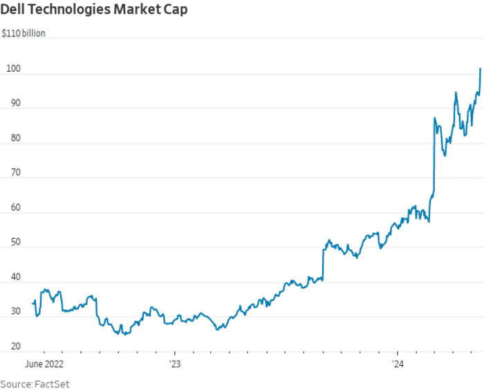 The strong momentum in Dell shares Wednesday puts the company on track for a milestone. Its market value is set to exceed $100 billion if current gains carry through to the close, according to Dow Jones Market Data. That would be Dell’s first time achieving the feat since it came public in 2018.