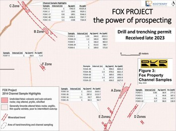 The 4,988 hectare Fox-Coconut Property ( Figure 2) is underlain by Eocene Ootsa Lake volcanic rocks in the west where a topographic high exposes fractured and silicified rhyolite volcanics hosting quartz veins and breccias. The Fox Showing area was hand-trenched and channel sampled in 2014 with results up to 45.3 g/t Au and 7,342 g/t Ag over 1.0 m6 ( Figure 3). The eastern portion of the Property is characterized as a complex assemblage of volcanic and sedimentary rocks which hosts several structurally controlled vein/dyke corridors hosting high-grade gold and silver and coincident base metals. The Coconut Showing area features a broad zone of propylitic alteration with more focused zones of quartz-barite+/-tourmaline, chlorite, magnetite related to northwest trending structures.