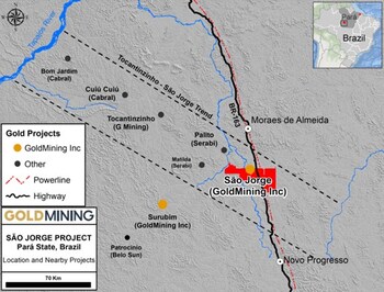 VANCOUVER, BC, May 29, 2024 /CNW/ - GoldMining Inc. (the "Company" or "GoldMining") (TSX: GOLD) (NYSE American: GLDG) is pleased to announce that it has recently commenced drilling at its 100% owned São Jorge Gold Project ("São Jorge" or the "Project"), a large-scale (45,997 hectare) project located within the prolific Tapajos Gold District in Pará State, Brazil.
