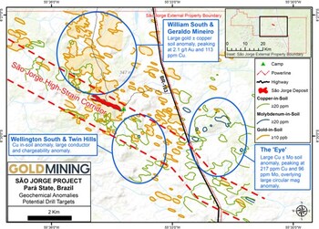 Tim Smith, Vice President of Exploration of GoldMining, commented: "We are excited to commence the first drilling program at the São Jorge Project in more than ten years. We expect the Program will build upon our recent exploration work that has expanded a regional scale gold and copper footprint. The Program aims to confirm a new geological model for the São Jorge deposit, which may help to optimize and improve confidence in our mineral resource estimate. The proposed drilling also tests a number of new target areas defined from our extensive geochemical and geophysical datasets. The mobile mechanized auger drill program is designed to expedite target definition by allowing us to rapidly test beneath broad high-tenor gold ± copper soil anomalies surrounding the São Jorge deposit, enabling us to vector into bedrock targets for follow-up core drilling. Overall, we're optimistic about the potential for new discoveries at São Jorge given it remains currently relatively underexplored, yet boasts indications of a significant mineral system located within a prolific gold mining district."
