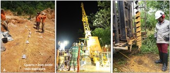 Figure 3 – Photographs of GoldMining’s local team conducting exploration work at São Jorge, 2024. A: Mapping and sampling along the exposure of a vein containing quartz + iron-oxide (weathered sulphides); B. Diamond core drill, night shift; C. Auger drill preparing configuration for sampling. (CNW Group/GoldMining Inc.)