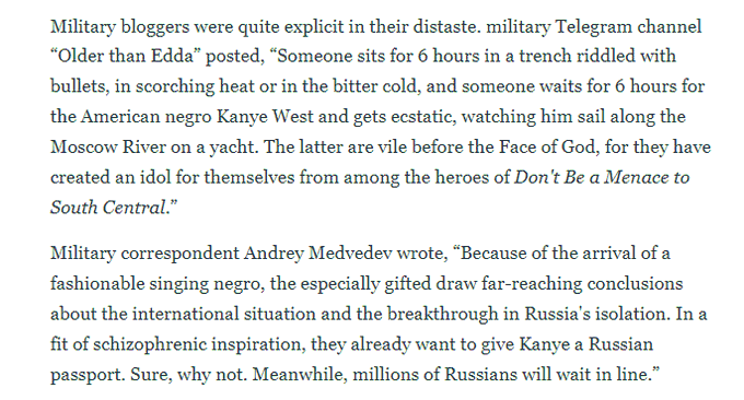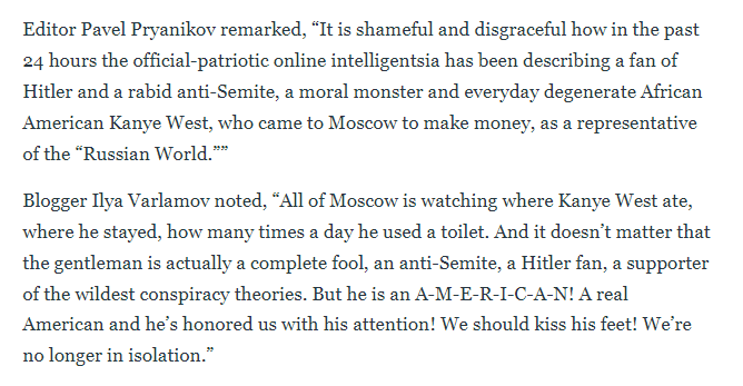 Russia’s fascist ideologue Alexander Dugin wrote, “By the way, ideologically, Kanye West is ours.” Perhaps he was referring to the comments West made on Alex Jones’ InfoWars, praising Adolf Hitler for what he "brought to the table."