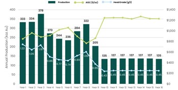 As shown in Figure 1 below, the current production profile, as per the Updated Feasibility Study (the "UFS") published on January 16, 2024 demonstrates an average annual production of 301,000 ounces over the first 8 years, stepping down afterwards as lower grade stocked material is processed after year 8. Given the recent exploration success, the addition of the Gbongogo Main higher grade satellite deposit (10.7MT at 1.43g/t Au containing 490koz of Probable Reserves) which is to be blended with the Koné deposit ore feed over the first three years of operations, has resulted in an average gold production of 349,000 ounces per year during this period given that the Gbongogo Main deposit reserve grade is approximately 95% higher than that of the Koné deposit ore feed over the life of mine.