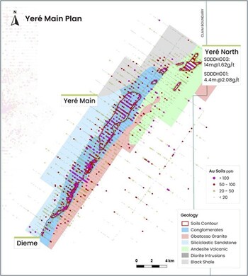 The Yeré North target is marked by a 2km-long gold consistent trend and is located at the Northeast of the Yere Main target which is a 14km gold in-soil untested geochemical anomaly. The geology consists of a Northeast striking sequence of andesite volcaniclastics and porphyritic andesite lavas intruded by a porphyritic diorite plug.