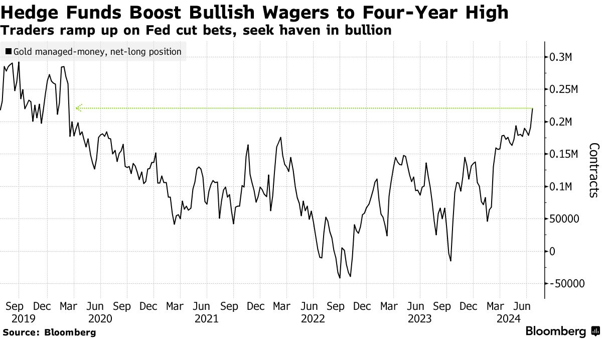 Money managers’ wagers in gold jumped to the highest level in four years, signaling investor concerns surrounding the US presidential election campaign as well as renewed focus on the timing of Federal Reserve interest-rate cuts.