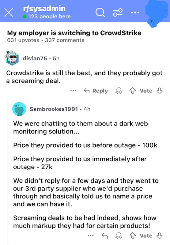 CrowdStrike (CRWD) anecdotal sales experience, from a recent thread at Reddit.