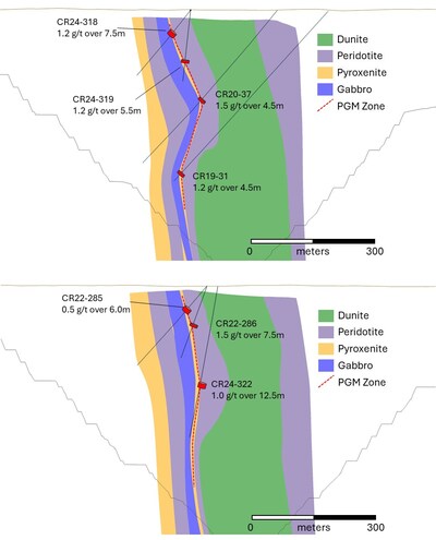 In early drilling campaigns at Crawford, "PGM zones" were identified (Figure 1) with platinum (Pt) and palladium (Pd) mineralization (Pt+Pd or PGM) occurring within a transitional boundary between the pyroxenite and peridotite units (the "PGM zone") that overlie the nickel-bearing dunites. In 2022, several areas were targeted for PGM mineralization throughout the whole Crawford property. Seventeen holes within the proposed Crawford pit are reported in this release. In 2024, a total of 31 holes were completed - 23 holes were drilled into the East zone, and eight new holes were drilled into the Main Zone to target the PGM zones. These zones are of interest as they reside within the boundaries of the proposed Crawford open pit and, as a resource had not been previously defined for the PGM zone, were treated as waste in the current feasibility study.
