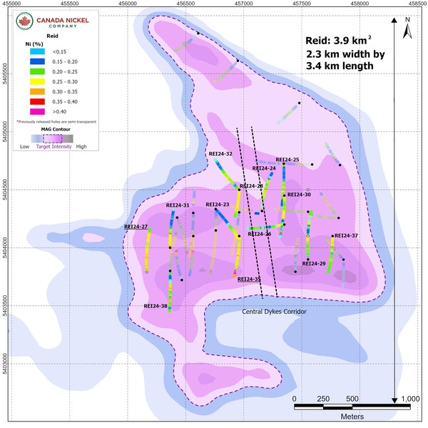 Mark Selby, CEO of Canada Nickel said, "Reid continues to deliver excellent results, including the best individual hole to date with long core lengths grading in excess of 0.4% and 0.5% nickel and all holes delivering large intervals of target mineralization. With a target geophysical footprint larger than our flagship Crawford project and a width in the central core more than double Crawford, we look forward to the initial resource estimate for Reid expected to be released in the fourth quarter of 2024."