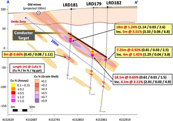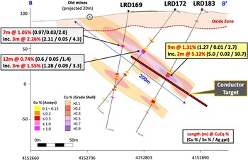 | Note that in Figure 2 and Figure 3 above, drillholes LRD 169 and LRD 172 were previously reported in a November 7, 2023 media release, " Pan Global Intersects 1.04% Copper Over 15.9 Meters at Western Expansion of La Romana Copper-Tin-Silver Discovery" and LRD 179 was previously reported in a January 8, 2024 media release, " Pan Global Intersects 1.6% Copper Over 9.7 Meters Confirming Continuity of La Romana Copper-Tin-Silver Discovery Over 1.4km".